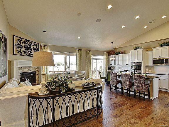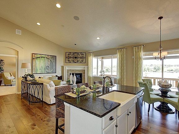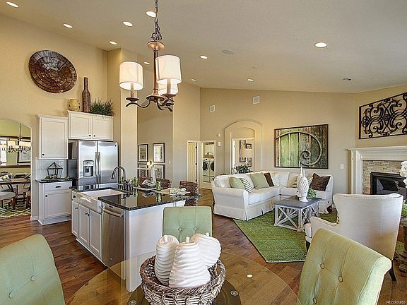 Move in Ready!! Open ranch home w/oversized 3.5 car garage features 3 private bdrms that give guests/family space of their own, main flr study and partially finished bsmt is great for entertaining but still plenty of room for storage. Spacious covered patio - perfect for relaxing or BBQ. Open great room w/ cozy fpl, extensive Weathered hardwood flooring throughout makes this home truly inviting. The Chef's kitchen is a delight w/ White Linen cabinets, White Springs granite, stainless gas cooktop, designer hood, 2 ovens, microwave and dishwasher that make cooking a breeze. This home is complete with A/C, blinds, full front & rear yd landscaping, sprinkler systems and full yard fencing. Great location close to the pool, clubhouse, playground, Dog Bone Park & walking trails. Down the street from the elementary school and Wrangler Park! Come see your new home in the rolling hills of Terrain! New home w/Builder 2-10 Limited Warranty. hotos are representative-not of actual home.