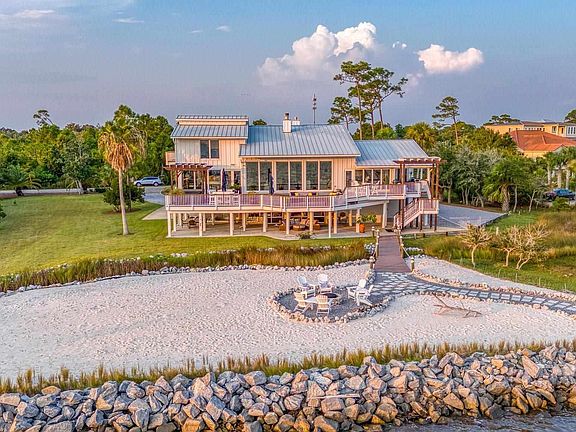 This is a rare opportunity to own a premier deep-water estate in Gulf Breeze Proper. Situated on 1.5 acres with over 200 feet on the Intracoastal Waterway, this stunning property features a rare 20x50 ft deep-water boat slip (9 ft depth) with flow-through dock and sun deck, a private white sand beach, and expansive green space. The home offers luxury throughout, including a great room with expansive windows showcasing breathtaking water views, a vaulted ceiling, and a gas fireplace. The custom kitchen is equipped with high-end appliances, a wet bar, and a dining area overlooking the Sound. The primary suite offers panoramic water views, deck/hot tub access, dual walk-in closets, and a spa-style bath with a soaking tub and separate shower. A main-level guest suite includes a private bath and patio access. Upstairs, you'll find two additional bedrooms, two full baths, and a large multipurpose room with a fireplace and French doors for added privacy. Additional features include a 3-car garage with a climate-controlled, large bonus room and half bath, plus a 200x200 ft vacant lot across the street included in the sale. Exceptional views, luxury finishes, and rare boating access make this a one-of-a-kind waterfront offering the ultimate Florida lifestyle.