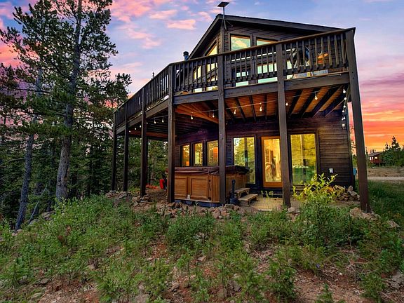 Bask in the views of the 14,000 plus foot mountains Bross, Lincoln and Democrat from the sun-drenched upper deck or soak up a night sky full of stars from the main level hot tub. The upper-level open floor plan family room features a wood burning stove to take the chill off cool mountain nights and a wall of windows to bring the outdoors in. The lower level provides more room to play and being fully furnished this home is move-in ready for full time or as an income property, short term rental licenses are still available in Park County. The home is rented almost entirely over the coming winter ski season, so showing will be limited to availability.
