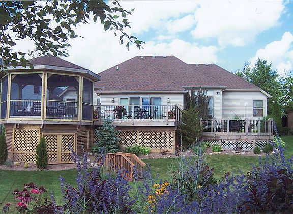IMPRESSIVE Custom 5BR 3BA ranch - Extra deep garage. Lots of natural light, EXPANSIVE VIEWS thru transom windows, 4-panel sliding doors, octagonal 16' screened gazebo, 2-tier deck 900 sq.ft - GREAT OUTDOOR ENTERTAINING! .42***ACRE beautifully landscaped backyard. MATURE trees, shrubs. PRIVATE backs up to field. Great floor plan w/dramatic ceilings. Fin.lower level w/radiant heat floors, kitchenette, bath, bdrms,den.