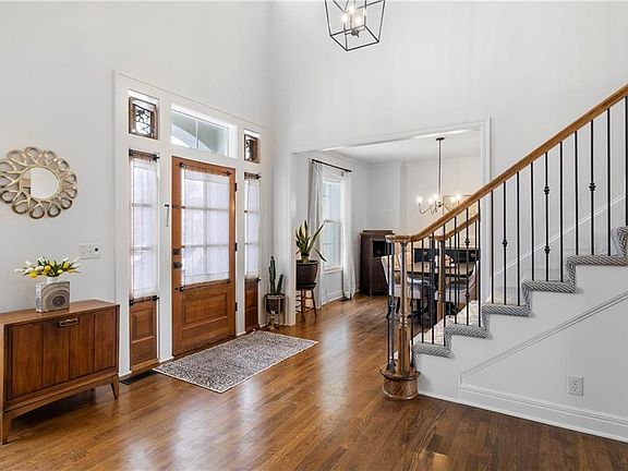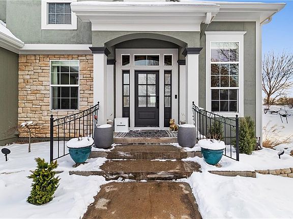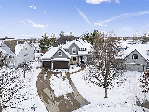 This lovely two-story residence is situated in a peaceful cul-de-sac within the Blue Valley North boundaries. The exterior of the home has undergone several updates, including newly installed gutters with guards, fresh paint, insulated garage doors, enhanced landscaping, and a charming covered patio w/ extended flagstone patio for grilling. Inside, you'll find various interior improvements such as brand new carpeting on the front /back staircase, convenient mudroom lockers, and updated faucets throughout. The main floor boasts a Den with built-in shelves and a Formal Dining Room. The spacious eat-in Kitchen features an expansive island, a walk-in pantry, a convenient pot filler, and high-quality Cafe appliances. It flows seamlessly into the inviting Family Room. Additionally, there is a fifth Bedroom on the main floor with a full Bath, which can easily be utilized as a second Office. Upstairs, all four Bedrooms are adorned with beautiful engineered hardwood flooring. The Primary Bathroom offers dual vanities and a tiled shower. A delightful open Loft serves as an ideal space for relaxation, whether it be for a cozy reading nook or a functional workstation. The lower level features a walk-up entry, generous Rec Room and ample unfinished storage space. The fenced backyard is level and showcases a serene coy pond and mature landscaping. Hurry to make this house your forever home!