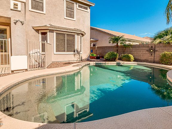 This 5 bed, 3.5 bath home is less than 2 miles from Luke AFB and surrounded by parks and playgrounds. Plenty of room to spread out with a 3 car garage, storage cabinets, RV gate, swimming pool and hot tub. Electric bills aren't a concern with this Solar equipped property. There are separate air conditioning units for upstairs and downstairs and both can be controlled by your phone or tablet whether you are home or away. The video Skybell allows you to see who is at your door via a phone app for extra security. Custom updated flooring and fixtures throughout, pre-wired surround sound, large windows and open 2nd floor has 2 split loft areas, spacious bedrooms with walk-in closets & a guest suite with full bathroom. Gourmet kitchen w/ stainless steel