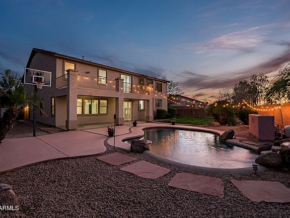Gorgeous 5 Bed / 3 Bath 4000 sq ft home with pool and 3 car garage. This home sits on one of the BEST lots in the community and backs to a large green belt with no houses behind. Popular multi-level floorplan with glass-insets and custom railing at the stairs and pony walls * French doors to backyard oasis * Nearly 1/3 acre w/ park views behind, Pebbletec pool w/ sand filters, extended covered patio with balcony, basketball court and plenty of grass to run around in! Private balcony from master suite * Extended master includes a sitting room that can be converted into another bedroom or a nursery or used as a home gym...endless options! HUGE Upgraded kitchen * Oversized island * Double ovens and gas cooktop * Built-in speakers inside the house and on the patio.