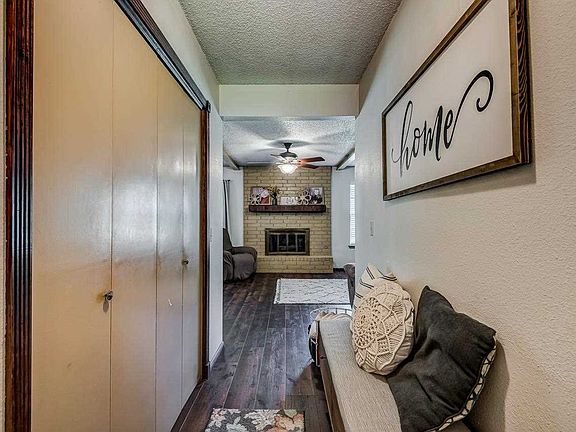 Come look at this precious home before it's gone. This three bedroom, two bath home is in a great location on a wonderful street. Enjoy the curb appeal, covered front porch entry, shutters and landscaping. Open the pretty front door to a foyer that leads into the living room. The living room has wood look LVP, a fireplace with gas logs and beams that add character. The LVP extends throughout the hallway and primary bedroom. The kitchen features a coffered ceiling, refrigerator that stays with the home, opens to the dining, opens to the washer/dryer, and leads to the backyard. Enjoy the fenced in nice size backyard on the covered patio. The exterior is brick with siding soffit and fascia, a sidewalk around the west side to the garage door entry and a storm shelter.