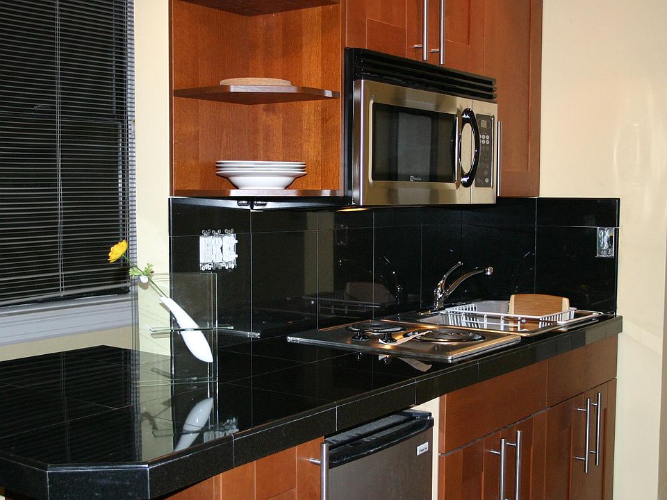 This renovated corner studio features a gourmet kitchen with granite countertop, stove, built-in microwave and refrigerator, freshly painted walls, medium-brown birch cabinets and plenty of storage. Bright and cheery atmosphere with hardwood floor, furnished with chest of drawers, bookcase and study table and chair. Easy access and walking distance to public transport.