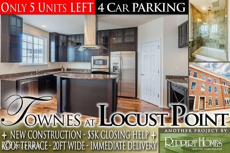 THE TOWNES AT LOCUST POINT-NEW CONSTRUCTION TOWNHOMES W/ SWEEPING HARBOR VIEWS & 4 CAR PARKING BY RUPPERT HOMES! Rear kit model feat hw floors & crown molding on main lvl, LR w/ gas fireplace, island kit w/ ss applncs & granite counters, Master suite w/ walk-in closet & Mstr bath w/ oversized shwr, wet bar, rooftop terrace w/ unparalleled harbor & city views! 1 OF 5 UNITS LEFT! IMMEDIATE DELIVERY