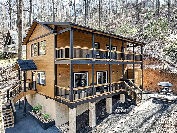 GORGEOUS NEW CABIN AVAILABLE IN CHALET VILLAGE! 3BR/3BA. Built in 2022. Sleek, modern design & finishes. Large, open-concept living area with vaulted ceiling and stone fireplace. Tons of natural light! Kitchen features attractive tile backsplash, stainless appliances, and gorgeous wooden countertop. Master bedroom on main level features high ceilings, deck access, and stunning ensuite with glass/tile shower and recessed lighting. Each bathroom in this cabin has a spa-like feel with matching marbled tile and modern finishes. Outside, enjoy the peaceful views from the deck, floating patio, or in the hot tub. Great location--only 10 minutes from the Gatlinburg strip. Great opportunity for your new vacation home or investment property! Over $107K in projected rental income. This cabin is a gem! Schedule your showing TODAY! (Drone Photography was used)