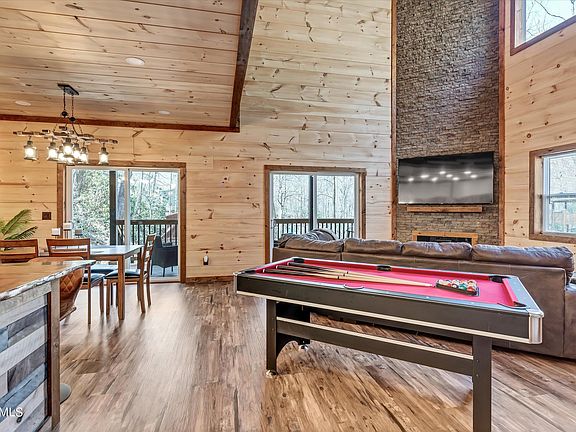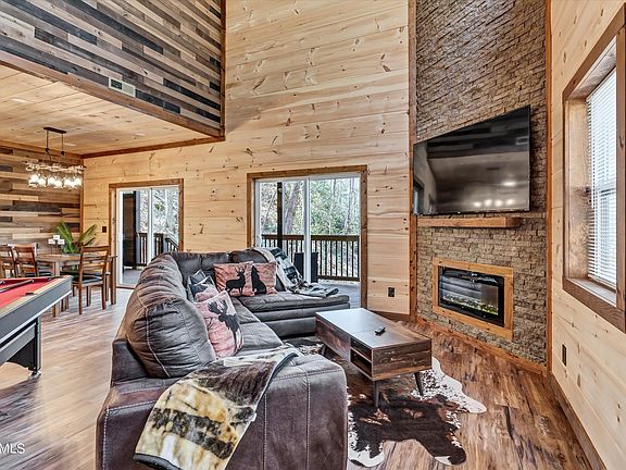 GORGEOUS NEW CABIN AVAILABLE IN CHALET VILLAGE! 3BR/3BA. Built in 2022. Sleek, modern design & finishes. Large, open-concept living area with vaulted ceiling and stone fireplace. Tons of natural light! Kitchen features attractive tile backsplash, stainless appliances, and gorgeous wooden countertop. Master bedroom on main level features high ceilings, deck access, and stunning ensuite with glass/tile shower and recessed lighting. Each bathroom in this cabin has a spa-like feel with matching marbled tile and modern finishes. Outside, enjoy the peaceful views from the deck, floating patio, or in the hot tub. Great location--only 10 minutes from the Gatlinburg strip. Great opportunity for your new vacation home or investment property! Over $107K in projected rental income. This cabin is a gem! Schedule your showing TODAY!