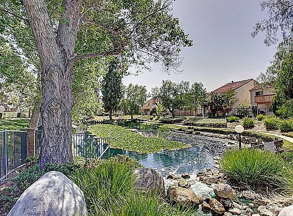 This beautiful unit is ready for its new owners! Elegant hard wood flooring, fresh designer inspired paint, and soaring ceilings complement the well-appointed kitchen with ceramic tile counter tops, recessed lighting with trey ceiling, gas range, solid wood cabinets, tile flooring, stainless steel fridge, and a built-in microwave. The adjacent dining area seamlessly connects with the kitchen and living room. Upstairs, enjoy the serenity of the spacious master suite with sizable cedar-lined closet, ceiling fan, dual mirrored vanity, and shower/tub combo. A spacious loft affords added entertaining and relaxing space. The huge secondary bedroom has light-catching windows, soothing view of an outdoor waterfall and stream, ceiling fans, and a generous closet with sliding doors. There is a two-car garage attached to the unit and several guest parking spaces. The HOA includes pool, spa, and lake access.