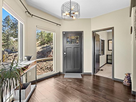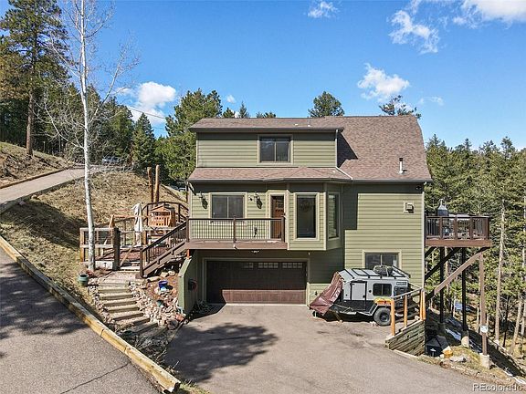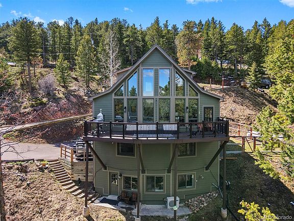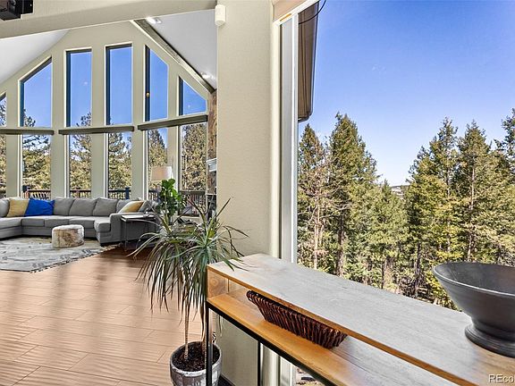 Welcome to your dream lifestyle destination nestled in the serene landscapes of Golden! This mountain haven offers the beauty of nature, gorgeous views, and lush green trees, all with easy access to I-70 so that you can enjoy the best of both worlds – seclusion and connectivity. Step into this captivating 4-bedroom, 3-bathroom retreat with a suite of upgrades designed to elevate your living space. Vaulted ceilings soar overhead in the great room, creating an airy ambiance that invites relaxation and rejuvenation. Step into the heart of the home and you'll find a large kitchen island with seating, six burner range, walk-in pantry, soft close cabinets, granite and butcher block countertops, newer appliances, an additional dining area, and a small nook with a desk. Indulge in year-round comfort with a pellet stove in the great room, air conditioning, a whole-house humidifier, a 1000 gallon owned propane tank, and a tankless water heater. Smart home features include a smart thermostat with temperature sensors throughout, electric blinds in the great room, and a 4-zone Wi-Fi controlled sprinkler system in the fenced-in yard. Embrace purity with a whole-house water filtration system and R/O water filter in the kitchen, ensuring pristine water quality. Safety is paramount, with a state-of-the-art ring camera setup included, as well as a radon monitor and dual mitigation systems. Storage solutions abound, including a 2-car garage with 240V hookup and 3 spacious sheds (Husky tool bench and 2021 Polaris ATV with snow plow included). A finished *separate* basement offers versatility (and privacy) as a home office, a gym, or additional living space. The property is complemented by a spacious deck perfect for entertaining, observing the surroundings, or simply soaking in the tranquility of the landscape, as well as gutter guards on the house and all sheds. Discover more than just a home; embrace an unmatched lifestyle defined by serenity and unparalleled convenience.