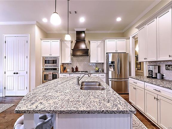Welcome to Glennbrooke! A fabulous open concept floor plan, the Walden's 5 bedroom 3.5 bath plan is perfect for families and entertaining. The grand impression starts in the foyer which connects to the formal dining room with coffered ceilings and wainscoting. The kitchen is a chef's dream complete with gas cooktop, stainless steel appliances, whisper-quiet upgraded dishwasher, rounded granite countertops, kitchen island with breakfast bar, plentiful 48 inch cabinets, walk-in pantry with custom shelving and a cozy breakfast nook. The family room is complete with a gas burning fireplace and plenty of room for two sofas. The first floor master bedroom suite is complete with granite double vanity, spacious closet with updated storage system, expansive fully-tiled walk in shower, soaking tub, private powder room. The first floor has 10 foot ceilings with upgraded crown molding throughout. The upstairs hosts an additional open living space, four well-apportioned bedrooms, two full bathrooms. Two unfinished storage areas/crawl spaces, additional attic storage provide climate-controlled storage thanks to the home's energy efficient spray foam insulation. Your entertaining space extends seamlessly to the outdoors onto a covered 18' by 18' East-facing patio, with ceiling fan, architecturally-matched cedar corbels...an ideal setting to cook, gather and enjoy Alabama afternoons. The fenced back yard is perfect for children and pets alike. Rain gutters, paver mowing strip, custom landscaping, complete the well maintained exterior. Glennbrooke is an ideal community complete with community pool, splash pad, private pond with walking trail, wide-open community green space. Sellers have added many post-closing upgrades and any new owner will be thrilled with the extra touches. Faux wood blinds throughout, fence, new extended patio, appliances, gutters, new lighting, closet systems, and landscaping are some of the amazing updates you will find.