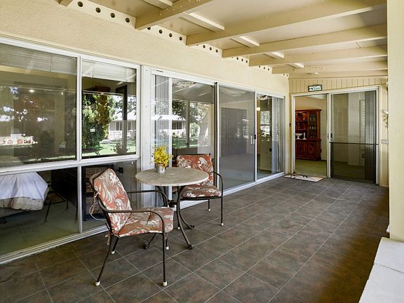Located on a tree lined greenbelt and steps from Central Park, this home's prime location gives its resident the quiet and serene surroundings one looks for when living in this beautiful community. This ideal spot can stay cooler with no direct sun, but natural light still pours in through the wall full of glass sliding doors. Enjoy tranquil days or evenings on the covered patio, which is a sizable 150 sq ft (approx) or a peaceful stroll through the park. Versatility describes this home's layout, as the entryway and adjacent room can be used for multiple functions such as dining, office, day bed, and hobby room, to name a few. A vaulted ceiling gives the living room a spacious feel and an open kitchen allows for a full view of the entire living space and outdoor greenbelt. A calming view of the outside is also a feature in the main bedroom. The bath has a large low step entrance shower and has ample cabinet space. There is also additional storage space in the patio area closet and in front of the carport. The parking space is a short walk from the unit as is the laundry facilities. Community amenities include an outdoor amphitheater, golf, gym, pool, community activities center, medical, library and bus transport. A special setting and location for this comfortable home. 55+ Senior community. Unit is 172K in Mutual 7.