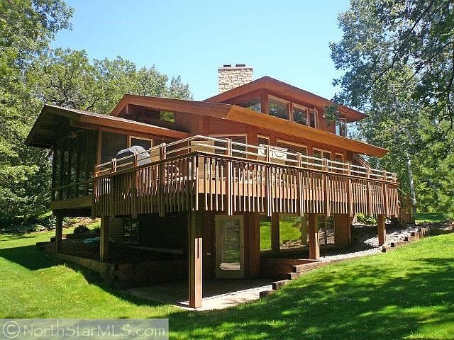 Stunning Frank Lloyd Wright style home nestled on over 4.7 private wooded acres. Incredible open floor plan, huge windows with tons of natural light, gorgeous 2 sty stone fireplace, rich oak floors, cedar walls, wood beams, granite, tile, private master suite & large lower level walkout.