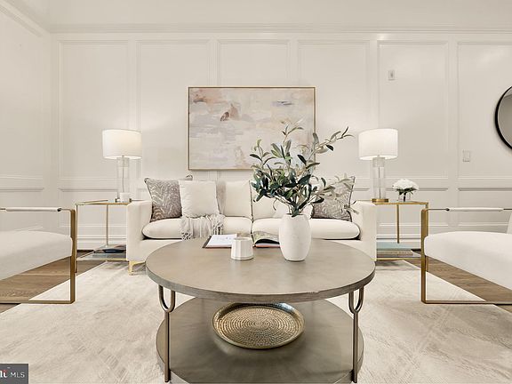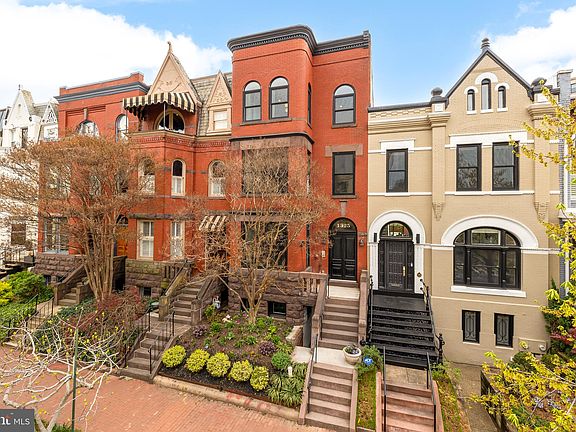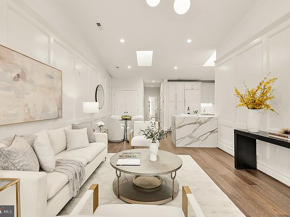 1325 21st NW is a stunning, boutique, red brick Victorian originally constructed in 1892, just before the turn of the century, and recently reimagined as bespoke residences. Rising above a verdant stretch just steps from Dupont Circle, it is the epitome of tailored urban living. At the apex of this rare offering is Unit 301, a two-bedroom penthouse spanning a generous 1,223 square feet with an additional 260-square-foot private rooftop terrace. Fully renovated in 2019, the residence is a seamless combination of modern luxuries and historic character. The entrance opens into the main living area, a generous space spanning a full 30 feet in length. Soaring ceilings and arched windows create an ethereal sensation, further enhanced by tall baseboards, elaborate picture moldings and paneling, and five-inch hardwood floors. Kohler, RH, and Baldwin fixtures and hardware throughout the home are a testament to the no-expenses-spared quality employed, contrasting with modern conveniences such as a sleek Iotty lighting system and a Nest suite of fixtures. The open kitchen is a chef’s dream, with professional Thermador appliances as well as stunning Calacatta Gold countertops, a peninsula waterfall, and a full-height bookmatched slab backsplash. The primary suite, tucked away at the rear of the unit, is ample in scale. Its ensuite bath is clad in marble, featuring a double vanity and a walk-in glass shower. An adjacent walk-in closet offers generous storage space. The second bedroom also features a private walk-in closet and has a dedicated full bath in the hall, appointed with equally stunning marble finishes and fixtures. A step-in laundry area outfitted with full-size Electrolux laundry machines rounds out the living space. A spiral staircase off the second bedroom leads up to the Trex roof deck, complete with a top-of-the-line pellet-style grill. Ideal for al fresco entertaining on warm summer nights, the space offers sweeping views of the skyline. An ADT system conveys with the home, as do sumptuous custom drapes throughout, a designated parking space, and two outdoor locking storage sheds to greatly enhance both utility and peace of mind. A comparatively low monthly condo fee covers both water and gas utilities. Less than two blocks from Dupont Circle and mere minutes from both the West End and Georgetown, the location is truly unparalleled. Offering a unique blend of livability, style, and character, Unit 301 at 1325 21st Street NW is a perfect piece of Washington history, reimagined for modern living.