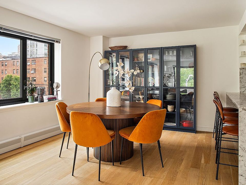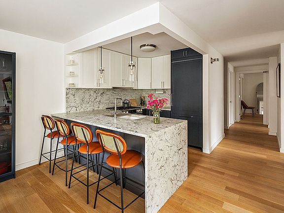 The kitchen is set up with an island configuration with marble counter tops- making it easy to host dinner guests while you cook. The living space is just short of 27 feet long, and allows ample room for a large dining table and couch. The living room gets flooded with beautiful Eastern facing light and has beautiful green views of the trees.