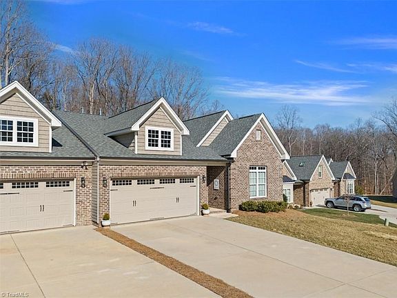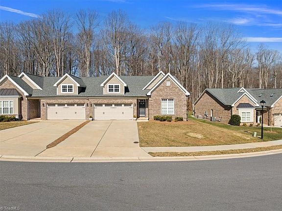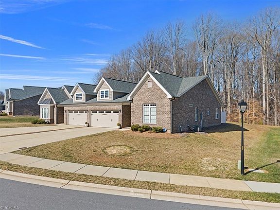 One level Townhome, located in the center of the Triad, Kernersville. Quick access to the Interstate, Winston Salem, High Point and Greensboro, PTI airport, restaurants, and shopping with Cul de sac main level living. Brick exterior with covered patio with wooded views. The interior features a stone gas log fireplace in the den underneath an architectural coffered ceiling, granite in kitchen and baths, dedicated laundry room with storage, stainless steel appliances and two car garage. The primary suite includes a walk in closet and separate shower. HOA takes care of the lawn to be truly low maintenance living.