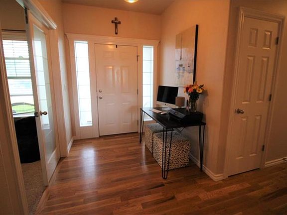 Don't miss the upgrades in this 3 bedroom w/office. Enter your new home through the 730 sq ft 3 car garage or the welcoming front entry with stunning hardwood floors that continue through to the large vaulted great room. The eat-in kitchen is a chef's dream. Split bedroom design gives you a secluded Master. The en-suite has dual vanities, tile floors, deep soaker tub, shower, and walk-in closet. In the winter cozy up by the gas fireplace or spend the summer in the back yard enjoying the new covered patio.