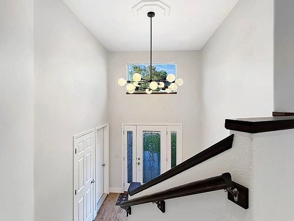 Stately stone entrywayCherry-stained cabinetryWhite quartz countertopsLarge laundry roomTrendy green cabinetryDual sinksModern chandelier
