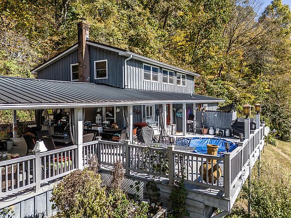 Discover your own slice of paradise with this really unique 2-bedroom 3 bath home situated on 6.63 wooded acres. This home offers the perfect blend of comfort, privacy and endless possibilities. This home lives large with open spaces while still incorporating defined areas for the kitchen, living room and bedroom areas. Some of the outside features include a huge, covered deck suited for entertaining large parties, front deck with a small pool, outdoor shower and a pretty view of the countryside. Also on the property is a tiny house, studio/workshop and a storage shed. Inside the home you will find a beautiful kitchen with a gas range, solid surface counter tops, hardwood floors throughout the main level, large bath with a large, tiled shower, large master bedroom with bath and walk in closet, large living room with fireplace open to the kitchen. Upstairs is a great room, bedroom bath and storage areas. This very unique home is a must see. Sq. Ft. information taken from tax record. Buyer to verify.