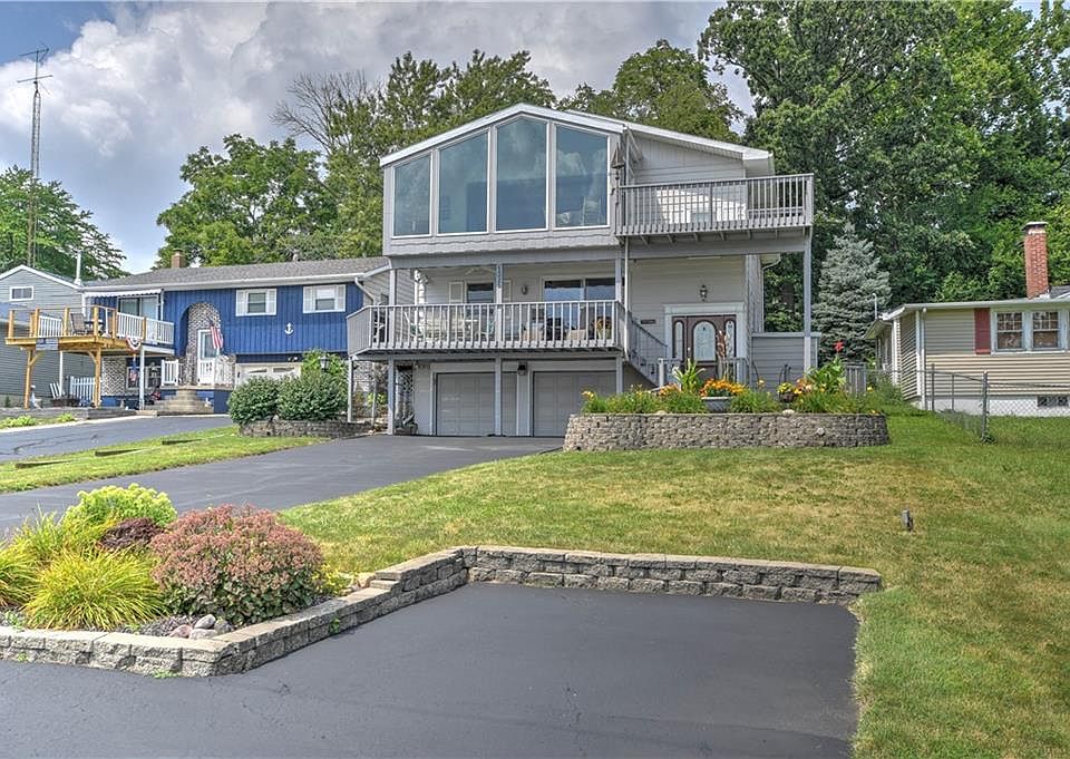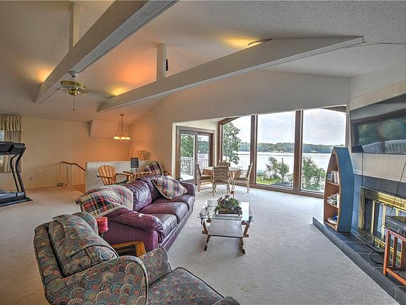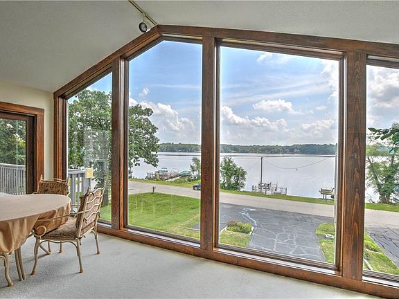 LAKE home with generous views facing east for your "good morning" sunrise. Select your seat on the main level deck, upper deck, front patio, dock, or step inside with views from the breakfast nook, or the awesome upper level family room with large windows that encompass the entire front of the home. Stunning family room vaulted ceilings with open beams, wet bar and gas fireplace; main level living room gas fireplace and main level laundry too. Updated full baths on each level, main floor master bedroom, walk-in closet, a shared bath with a large walk in shower and dual sinks. Two upper level bedrooms offer walk-in closets and each closet offers a surprise vanity. A lower level den/office (unofficial bedroom) and bath with new shower walls w/tile accents, plus a rec room/flex space. Dock deck concrete and wood is improved, roof 2020, HVAC 10 yrs. Original 1924 home was a small one story. Home and property meticulously maintained, many unique features, a pleasure to show.