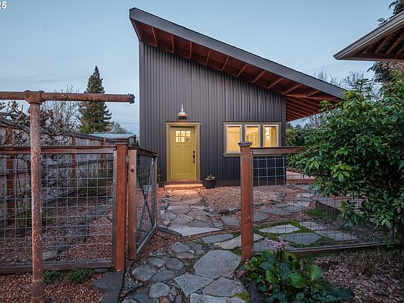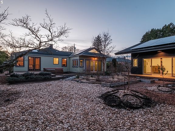 Unique property with 2 buildings & an amazing garden, near shopping & schools. Cozy living with fireplace, open to a covered front porch. Bright kitchen & custom nook. 2 BRs & office open to full deck & hot tub, radiant heat floors, updated full bath. Passive solar studio/ADU with vaulted ceilings, wool/foam insulation & cork floors, shower & loft. Master-cultivated garden with UGS, fruit trees & shrubs, chicken coops, treehouse. Newer roofs with solar panels, heat pump, tankless water heater, EV charger