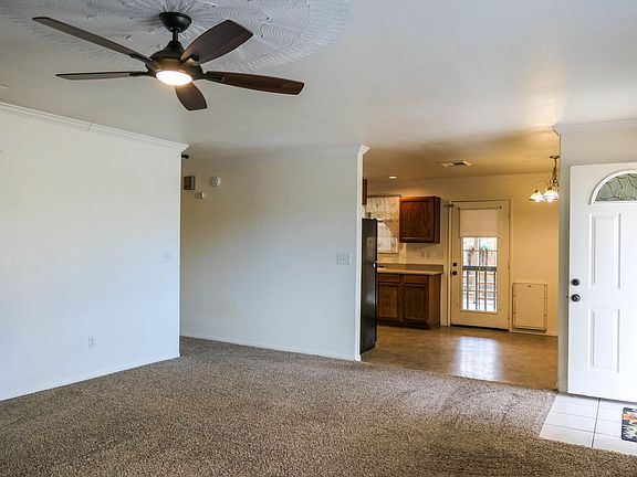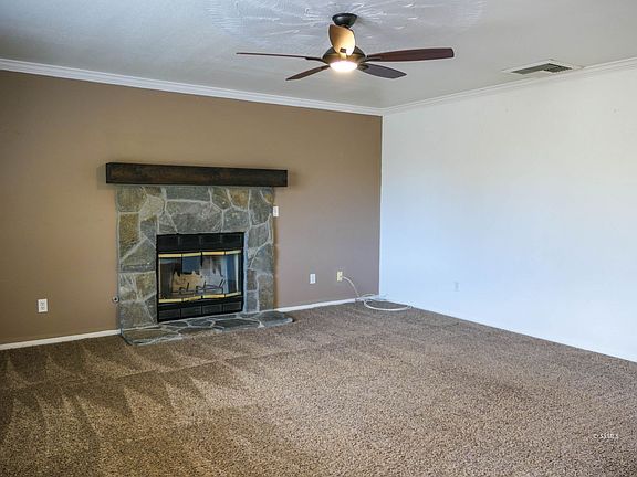 DESIRABLE & AFFORDABLE! Roomy home in Ridgecrest Heights. Step up to a xeriscape front yard with a palo verde tree. Inside a large living room with crown molding, gas fireplace, large picture window, ceiling fan, and dark brown carpet. Kitchen hosts Corian solid surface counters, white ceramic sink, gas oven, countertop microwave, dishwasher, and a black refrigerator. Master bedroom with great sized walk-in closet, ceiling fan, and French doors leading to the patio. Master bathroom with a tub/shower insert and vinyl on the floor. Other bedrooms offer space and ceiling fans, while bedroom two has a walk-in closet of it's own and newer carpet! Hall bathroom with tub/shower unit. New toilets installed in 2019. Check out that full length patio out back!! Large enough for large friends and family gatherings! Backyard ready for your personal touches. MasterCool unit on the ground. Furnace in the attic. DON'T PASS THIS ONE BY!