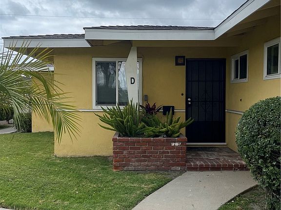 Remodeled 2-Bed, 1-Bath Single-Story Unit in a Quadruplex unit #D. Welcome to this beautifully 2-bedroom, 1-bathroom located in end unit. This charming unit features fresh paint throughout, brand-new dual-pane French doors, and newer dual-pane windows in the bedrooms and living room for energy efficiency and comfort. Enjoy the warmth of repolished oak hardwood floors and refreshed kitchen cabinets, complemented by durable tile flooring in both the kitchen and bathroom. Each room is equipped with a new ceiling fan for added comfort. Relax or entertain on the spacious private patio perfect for B.B. Q, morning coffee, or simply enjoying the outdoors. The home also includes a detached one-car garage and is conveniently located near shopping centers, restaurants, parks, major freeways, and Disneyland.