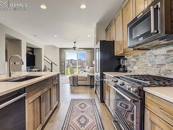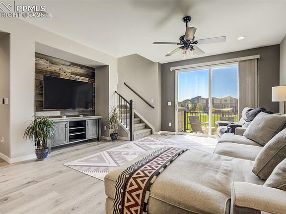 This lovely Classic Built home is in pristine condition & exudes elegance and charm in every aspect of its design. Impeccably maintained, the home offers a large open floor plan for the living space with a walkout deck & a beautiful southern view. The design features in the gourmet kitchen include black stainless appliances, gas range/oven, custom backsplash, solid surface quartz countertops, spacious pantry, gorgeous hickory cabinets, a large island with plenty of seating & the dining area includes a slider door-walkout balcony with a northern view. Both balconies bring tons of natural light into this spacious home. For convenience, a half bath is included just off the living area. The upper level features the sleeping quarters & laundry complete with washer & dryer. The primary bedroom includes a walk in closet & a retreat like ensuite bath with a rustic barn door feature, quartz double sink vanity & a frameless walk in shower enclosure. The second spacious bedroom also includes its own ensuite full bath with quartz counters & tub/shower combo. The lower level flex room makes for a perfect office or work out space. Step out into the oversized immaculant 2 car garage & notice the clean epoxyed floor & custom built shelving for tons of storage. Other highlights include a gas line on the deck, brushed nickel fixtures & handles, 12x12 tile flooring in all bathrooms & laundry closet, ceiling fans, 8lb pad under the carpet for comfort & quiet foot traffic. This lovely home was also pre-wired for a security system & additional internet ports were added to accomodate the perfect work from home situation. A nicely landscaped large grassy open space sits directly in front of this beautiful home, a perfect area to play with pets. Plenty of guest parking is also available nearby. Location is prime and close to shopping, dining, and local travel routes including easy & quick access to I-25. Come see this lovely home, perfect for your next chapter in life!