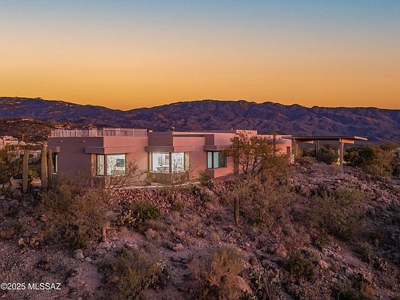 Perched hilltop and resting on one of the best homesites in Redington Ranch, find luxurious Tucson living at its finest! This thoughtfully designed & custom-built sanctuary waits for you to come home. Grandiose & poised, with truly magical 360-degree views; when the sunlight hits just right at every hour of the day, and where tranquility can be found at every turn. The soaring high ceilings and expansive windows offer a timeless elegance while showing off the dancing mountain ranges. Clean lines, neutral colors, and a contemporary aesthetic, serves as the perfect foundation to feature your own style, design, or art collection. The great room, with see-through fireplace, flows into the formal dining and gourmet kitchen. Custom cabinetry, premium appliances, a huge island and wet bar... make entertaining a breeze. This impressive property is stacked with as many amenities as it is beautiful! Includes the convenience and luxury of owned solar and community equestrian facilities!