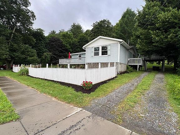 This charming home is set just on the edge of town and next to a large wooded, open space, with a large front deck with valley views. The bright kitchen leads out to the side double deck, which doubles as a carport, and the living room addition means everyone has room to relax. Three bedrooms and a bath round out the main floor, and how convenient to have single-level living. The new roof and high-efficiency forced air propane heat pump system offer great value in years of enjoyment, and central air keeps everyone cool in the summer. The property is well set on the half-acre lot, and the outdoor space is terrific for relaxing or entertaining and offers privacy with fencing and a water feature with a frog pond. Poured concrete basement with high ceilings, laundry, and a bonus room. Great location with proximity to the town's amenities, and nearby the Fingerlakes Land Trust King Preserve. Centrally located and only about 30 minutes from Ithaca, and 40 from Binghamton.