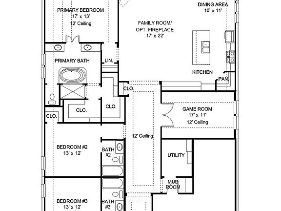 Entry welcomes with 12-foot ceiling. Game room with French doors and 12-foot ceiling off extended entry. Kitchen and dining area open to spacious family room with wall of windows. Kitchen hosts inviting island with built-in seating space. Primary suite includes bedroom with 12-foot ceiling. Double doors lead to primary bath with dual vanities, garden tub, separate glass-enclosed shower and two walk-in closets. Abundant closet space and natural light throughout. Covered backyard patio. Mud room off three-car garage.
