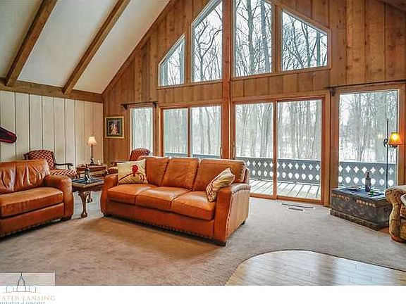 Hill top Chalet! Gorgeous rustic style lodge nestled on 14 wooded acres, over 2800 fin SF of character & charm, hand hewn special railings volume, vaulted ceilings & Huge 2 story pole barn with 10' door! Amazing home in the woods! This incredible work of art is a one owner home and has been beautifully updated! The show stopper is the 2 story vaulted, beamed great room with striking floor to ceiling fieldstone fireplace and window wall of glass allowing the outdoors in. All year long, the seasons will be part of your interior sca pe! The kitchen features granite tops & indoor grill & stainless steel appliances! The second floor loft makes the perfect office or study featuring built ins and special lights. There are 3 spacious bedrooms on the main level, one with hardwood flooring and all have hand hewn wainscoting, adding to the appeal of the home! The lower level has full wall of sliding glass, huge family room with attractive fireplace featuring travertine tile, rich wood flooring & lantern lighted accents, possible 4th Bedroom with 2 double closets and newly finished attached bath! (Bedroom would exit outdoors through FR sliding doors). Huge laundry room with tons of storage and built in shelves. Updates include: Roof 2012, Geothermal heat 2015 with elect base board supplement, new 200 amp elect, citrus softener system, Nuvo water system, whole house water system and new water holding tank. Stainless steel Barn 2 story vaulted with 3’ overhang and walk up storage. Big 8 acre open field/pasture at the back of the property! Only 15 miles to downtown Lansing!