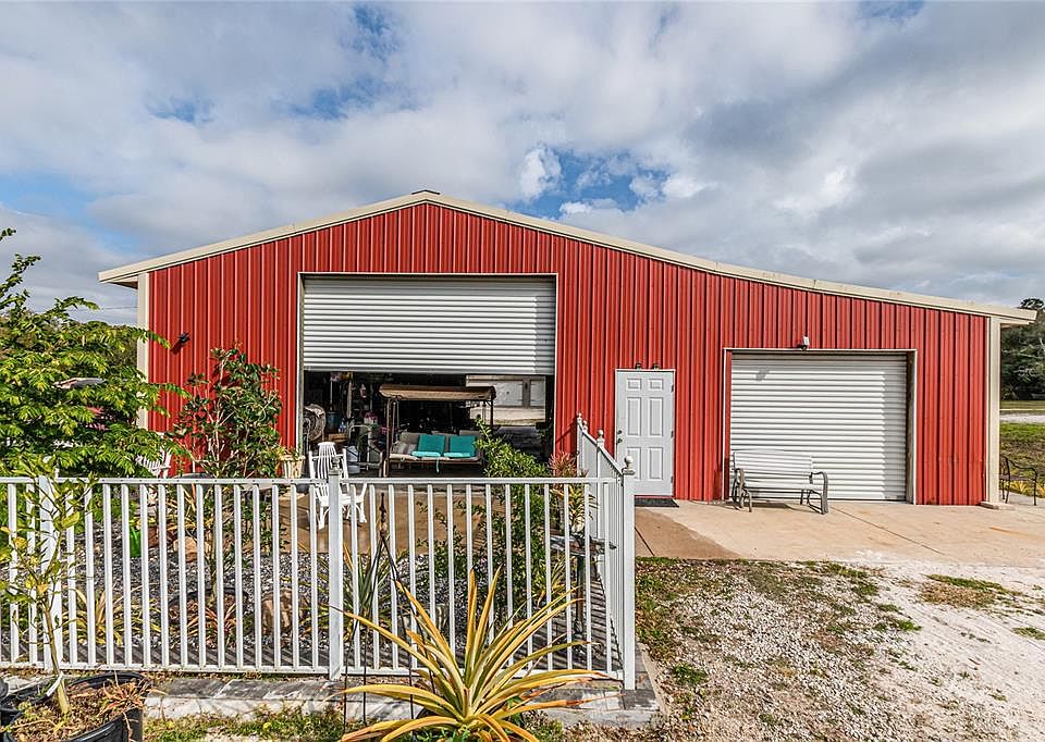MUST SEE unique home nestled on 1.19 acres in beautiful Dover! Bring your animals and horses to this fabulous property featuring a one-of-a-kind barndominium with 1 bedroom/1.5 bathroom and plenty of space for your RV! Built in 2007, this special home includes 2000SF of barn space and a gorgeous 750SF studio-style living space. The studio was added in 2017 so everything is almost brand new! You will appreciate the beautiful laminate flooring throughout. The kitchen boasts white cabinetry, stainless steel appliances, and attractive formica countertops. The bathroom is spacious with tile floors, a shower/tub combo, single vanity, and a barn door. The home is triple insulated with laundry and tons of overhead storage. Enjoy your morning coffee on the front patio with an adorable white vinyl fence. Newer features include; septic/new lines (2017), new pump house, electrical panel, and brand new hot water heater (2021). The barn also includes one electric bay door, one oversized roll up bay door for RV or large equipment. Located in Unincorporated Hillsborough County, there is NO CDD or HOA! Convenient to I-4, 1 mile from Strawberry Crest High school, shopping, restaurants, entertainment. Country life with all the convenience of the city within easy reach! Dont miss this super unique opportunity!