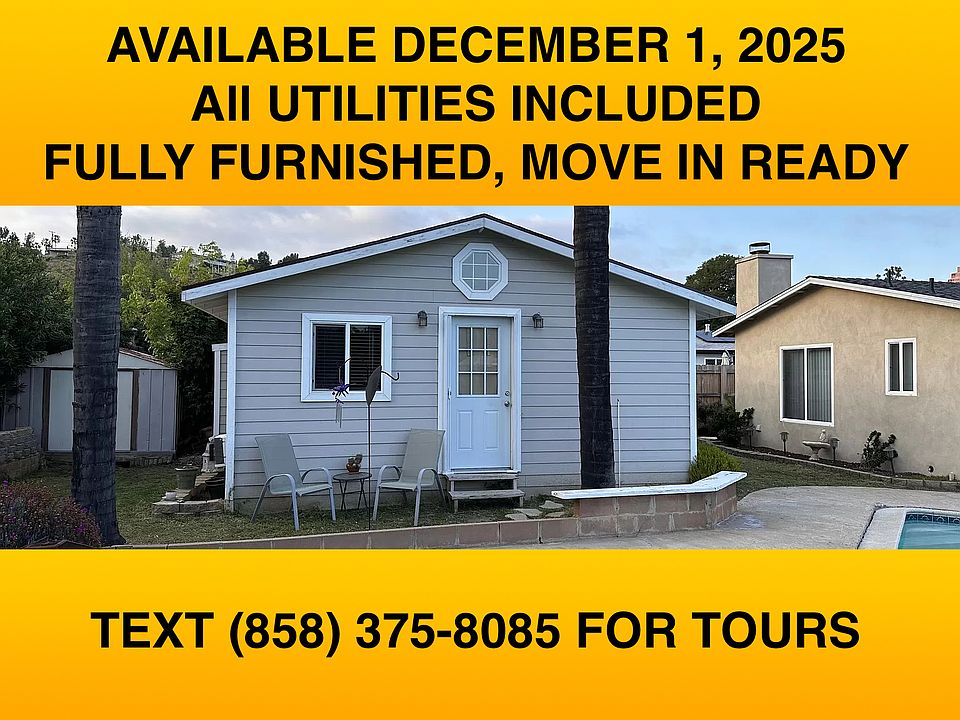 Reduced monthly rate for short term leases, 1-6 months *ALL UTILITIES ARE INCLUDED IN PRICE -HIGH SPEED WIFI -CABLE -ELECTRICITY AND WATER -TRASH PICKUP *HOME IS FULLY FURNISHED *SHORT OR LONG TERM LEASING *AVAILABLE ON MONDAY DECEMBER 1, 2025 Beautiful cottage in the heart of Poway. Don't let the size deceive you! This is a completely detached ADU in a private and quiet backyard. This home is also fully furnished with amenities, including a full sized refrigerator/freezer, coffee maker, microwave, toaster, hot plate, dining table, desk, full sized bed, and sofa, storage cabinets and more! You will love the spacious design sprinkled with modern and contemporary art, high vaulted ceilings, sliding pocket doors, lightly painted walls, and multiple windows all to provide more space, light, and elegance. In the living room, you'll find a 60" HDTV with an included Cox cable subscription featuring 140+ channels, along with access to all of your favorite streaming apps. Throughout the home, you will enjoy gigabit wifi speeds with unlimited data and your own Eero router ready for an ethernet hook up. Perfect for those working from home. You will also find a wall mounted AC and heating unit. In the bathroom aside from the usual, you will find a walk-in shower and a washer and dryer. The bedroom has sliding closet doors with plenty of space to hang clothes and a dresser. The backyard is the perfect place to enjoy the Southern California weather any time of year. You will have access to the pool, fire pit, and seating areas. Just one mile away, you will find many shops and restaurants. The closest hospital is Palomar Poway, less than 5 miles away. This home is perfect for those working from home or working as a traveling professional. Fees and Deposits: *$1,250 deposit is refundable upon move out. *$250 nonrefundable cleaning fee required for deep cleaning of fabric upholstery and replacement of linens upon move out. *First month's rent ($2,195), refundable deposit ($1,250) cleaning fee ($250) are due ahead of move in date. *Additional refundable deposit of $500 required for pets. *Pets are considered on a case by case basis at full discretion of the landlord. Additional Info: *Street parking available *No smoking of any kind *The lease term is flexible allowing for month to month after a minimum stay of three months.