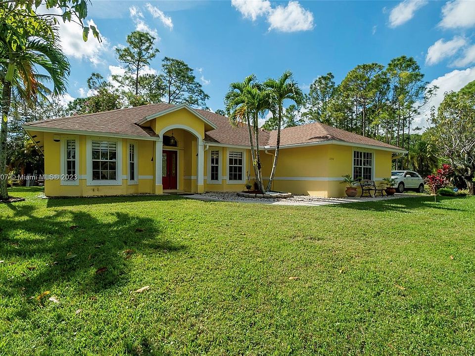 Remodeled and ready to move in Home in the Acreage, NO HOA, located on a paved road. This very well maintained 3 bedrooms, 2 bathrooms home with pond sits on a corner lot with 1.37 acre with canal. Completely fenced with beautiful entry solar gate, large shed, mature landscaping & fruit trees like Avocado, Mango, Sugar-apple, Coconut, Passion fruit, Fig, Papaya. Bathrooms and Kitchen were upgraded, new roof (Dec 2019) new A/C 2023, new water heater 2023 kitchen was upgraded with quartz countertops & stainless steels appliances, title floors throughout, closets built-in, murphy bed built in, security system, sprinkler system and so much more. Top rated schools, a short drive to major highways and shopping.