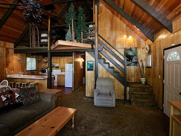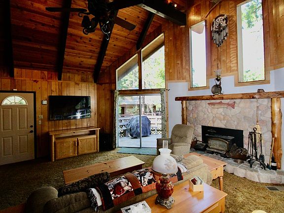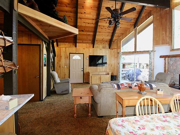 Cute, Cute, Cute. This vintage cabin has a large open area with the living area that features soaring vaulted, open beam, knotty pine ceilings to provide a wide-open feeling, picturesque windows to let in the sunshine and to see the trees, stone fireplace with a woodstove insert, large deck overlooking the lake with 3 bedrooms, two baths, and a loft for that being away from home and at the cabin feel. Additional downstairs space with laundry and enough room to make a recreation area. This cabin comes fully furnished. After a long day, you will enjoy the quiet solitude of sitting on the deck that overlooks the lake. Walking distance to the lake is extremely short which would make this cabin a great vacation home or VRBO.