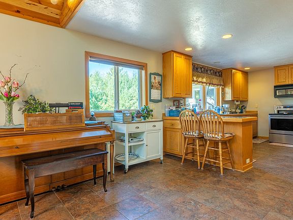 Storage buildingLog railing accentsPrivate master bathBay windowScreen houseGranite countersWood cabinets