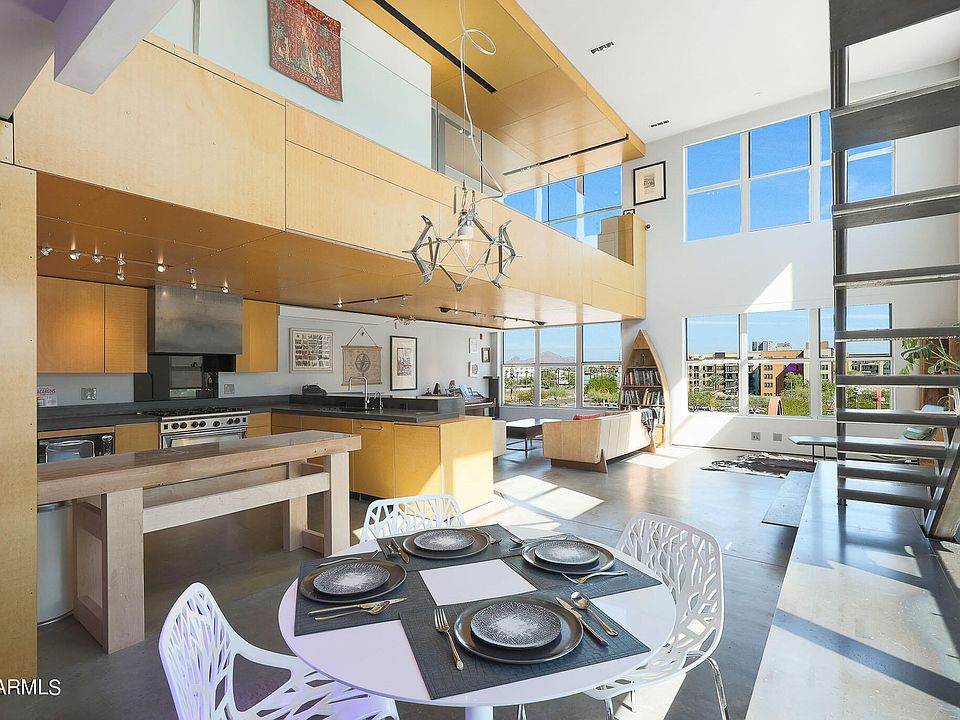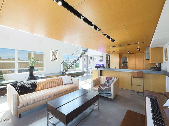 Architectural masterpiece offering a downtown loft living experience worthy of satisfying the most refined taste. Arguably the most premium location and vantage point within the Artisan Lofts, this spectacular South East corner unit exposes jaw-dropping downtown, cityscape, and Camelback mountain views from 3 spectacular levels. Generous living space at roughly 1800 sq/ft, this 2 bed/2 bath plus large light-filled and open Office can also expand onto the private & ultra-exclusive urban rooftop garden and patio space. Sky-high vaulted ceilings accentuate the expansive walls of windows with automated shades revealing views both day and night. Original interior design by renowned Architect Mark Ryan FAIA and then refreshed for previous owners by the one and only Will Bruder FAIA, who also collaborated on the iconic design of the Burton Barr Central Library which you can admire through your windows right across the street. Enjoy all the upcoming Super Bowl activities scheduled at Margaret T Hance Park with a birds-eye view from your balcony. Walking distance to the Light Rail, Phoenix Art Museum, recreation, sports, music, and the incredible downtown dining scene will be just outside your doorstep year-round. Site amenities include an outdoor heated pool & spa on the ground floor, landscaped walking path, 2 dog runs, a community rooftop patio & outdoor kitchen, fitness room, conference room & secure garage parking with 2 adjacent designated spots for this unit. You deserve to enjoy your life in style; hurry as opportunities to own one-of-a-kind and truly inspiring artistic spaces like this rarely come along.