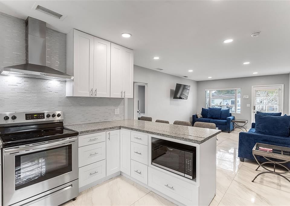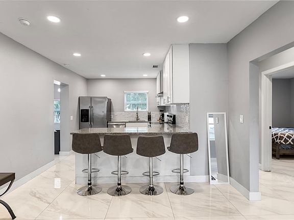 Open and spacious with a gorgeous, sleek and modern interior remodel featuring large porcelain tiled flooring throughout, large open concept kitchen with breakfast bar, stainless steel appliances, undercounter microwave, family room plus extra Florida room could be third bedroom, office, gaming room. Nicley sized bedrooms with stylish finishes and features. Beautiful completely updated and modern bathroom with custom tiled walk-in shower. Huge, fenced backyard with inground free-form pool. Central Fort Lauderdale location close to beaches, nightlife, dining, and downtown!