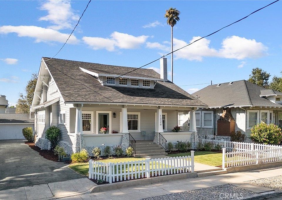 Quintessential California Bungalow in Coveted Downtown San Luis Obispo Neighborhood. Built in 1918, this stunning home offers a unique blend of vintage charm and modern amenities, with historical architecture throughout. As you arrive, you're greeted by the inviting front porch, perfect for relaxing and enjoying the serene surroundings of this quiet street. Step inside to find a spacious living room featuring a cozy fireplace, built-in bookshelves, a box-beamed ceiling, and abundant natural light. The charming kitchen is equipped with a 6-burner Thermadore range, a stainless steel dishwasher, an undermount sink, and Carrara gorgeous marble countertops. The adjacent sunroom provides plenty of space, the laundry room, a Dutch door, and access to the backyard. Throughout the first floor, you'll find expansive 10-foot-plus ceilings, original hardwood floors (recently polished), and 10-inch baseboards that add to the character.