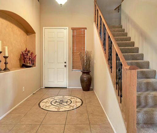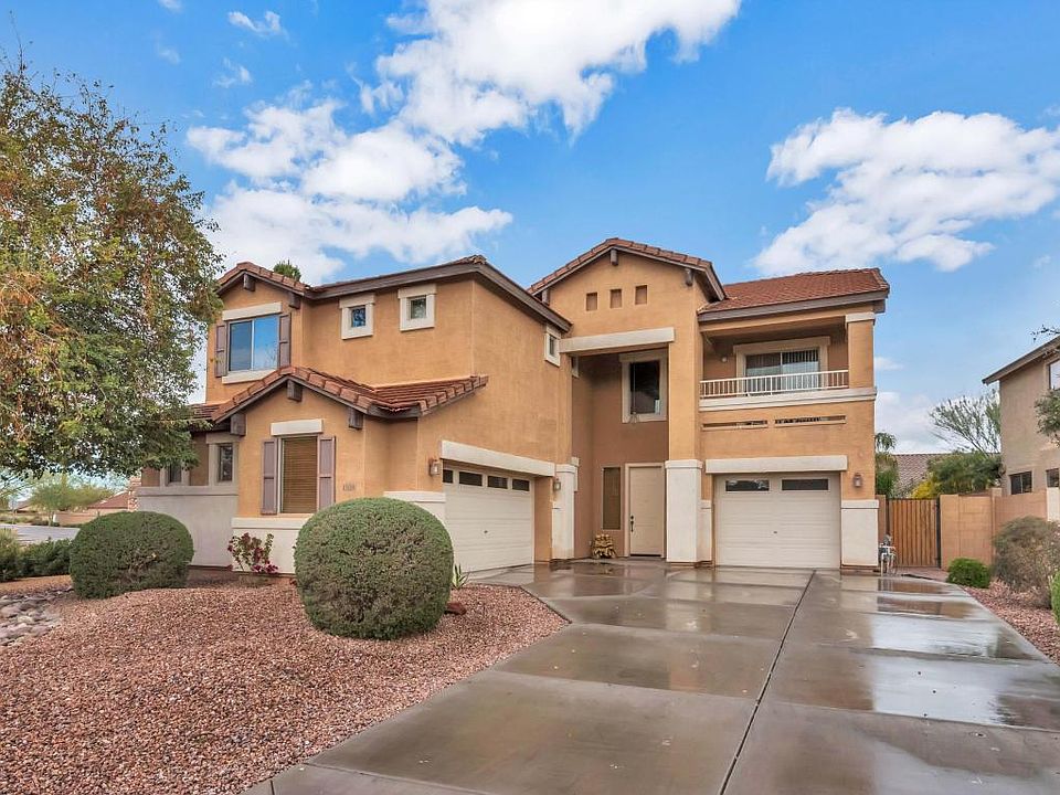 Must See! Room to roam! Light & open, eye catching thru/o w/tons of upgrades. Immaculate. Large cook's kitchen, tons of maple cabinets, granite/travertine back splash, island, lg pantry, 20 in tile. Wet bar w/glass front cabinets, granite counter adds a touch of elegance to dining room w/soaring 2 story ceiling. 1 in faux wood blinds thru/o. Wood & wrought iron banister to upper level & exposed loft. 4 bedrooms/2 baths up. Luxurious master w/private balcony showcases mountain views, monster walk/in closet & master w/soaking tub/separate shower, 2 sink counter/upgraded fixtures. Neutral tones t/o. 3 garages split double & single (perfect for he or she cave!)Lovely back yard w/orange & lemon trees, drip & side dog run. Patio & upper balcony w/mister system. Community park across street.