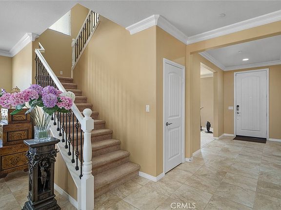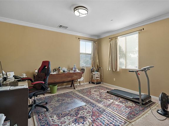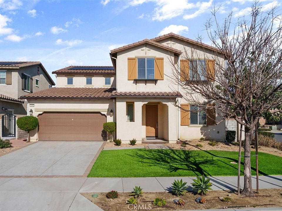 Prime Eastvale Location in the Desirable Estancia Community! Situated on a corner lot, this stunning home offers exceptional curb appeal with lush artificial turf for low-maintenance living. Step inside to a welcoming tile entry that leads to spacious living areas and elegant finishes throughout. The formal living room off the entry can easily serve as a home office or study. A large formal dining room is perfect for entertaining, while the open family room features a cozy fireplace and flows seamlessly into the expansive kitchen. The kitchen is a chef’s dream with granite countertops, an extended island with bar seating, a built-in cooktop, and a double oven. This home also features a downstairs potential NextGen suite, complete with its own kitchen, bedroom, and full bathroom—ideal for guests, multigenerational living, or a rental opportunity. Upstairs, enjoy a spacious loft and a luxurious primary suite with a large retreat area, perfect for relaxing. The primary bathroom boasts dual sinks, a walk-in shower, a soaking tub, a vanity area, and a huge walk-in closet. Three additional bedrooms share a full bathroom with dual sinks. The convenient upstairs laundry room includes built-in shelving for extra storage. Additional highlights include most furniture, solar panels, and crown molding throughout. The beautifully landscaped backyard is perfect for entertaining, featuring a covered patio with a built-in fireplace, stamped concrete, and plenty of space to relax or host gatherings.