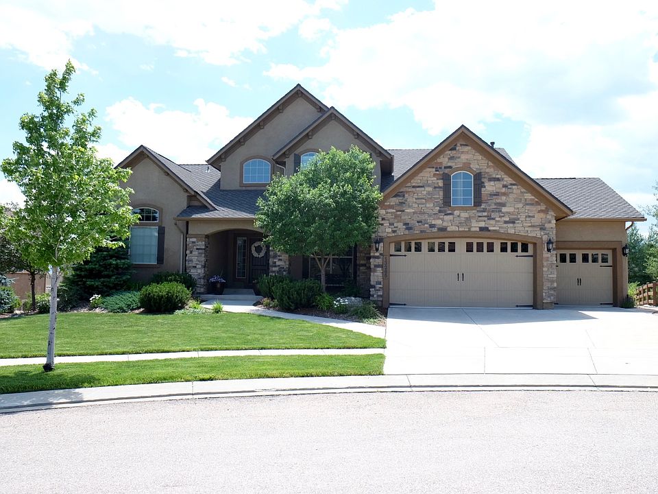 COMPARE to New Construction in desirable Flying Horse! BEAUTIFULLY appointed and DESIRABLE Classic Homes "Dynasty” two story floor plan, elevation “C” with INVITING low-maintenance stucco/stone exterior and walk-out basement on a premium west-facing cul-de-sac lot with VIEWS! VIEWS! VIEWS! Six spacious bedrooms, 4.5 bathrooms plus open loft office and main level master suite offer a functional layout ideal for entertaining. The interior is MODEL-HOME comparable, impeccably styled, and in meticulous condition from carpet to every surface. Soaring ceilings immediately welcome you in with breath-taking mountain views, and the 2-story high stack stone gas fireplace invites you into the heart of this home. The kitchen layout is a CHEF’S DREAM complete with upgraded stainless steel appliances, solid alder cabinets with under cabinet lighting, an abundance of granite slab counter tops, large island with gas range and wine refrigerator and solid wide-planked hardwood floors. Adjacent, the "Montana" family room with another stack stone fireplace, tongue-in-groove and overhead custom wood beams, invites you in. The spacious Main-Level master retreat with yet another two-way fireplace beckons you to the large soaking tub, custom tiled walk-in shower, his/her closets and french doors draw you outside to the 16’X28’ rear deck to enjoy the mountains/Pikes Peak! The retreat continues with a light and bright walk-out basement featuring 9’ ceilings, bedroom en suite, optional workout room, large wet-bar with refrigerator, opening to an expansive stamped/stained concrete patio with custom built-in outdoor wood-burning fireplace that family and guests are sure to enjoy. Mature front/rear landscaping with plenty of grass and an in-ground trampoline for the kids. Car/Gear-lovers will not be disappointed with the 3-Car+ finished garage with extra shop/storage area and epoxy-finish floor. Stylish custom window treatments throughout, in-ceiling speakers, Nest thermostat... too many extras to list. Great family-friendly neighborhood adjacent to highly desirable D-20 schools, parks, shopping and entertainment. Just minutes from I-25 and 45 minutes from Denver! Compare the extras here that far outweigh what new construction offers. This home is MOVE-IN READY!