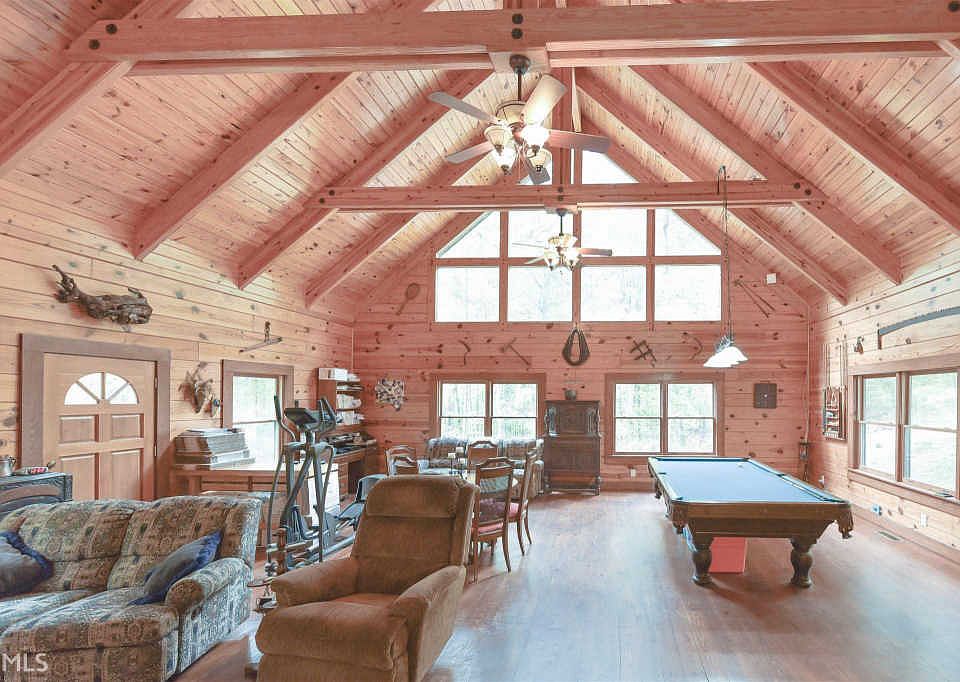 Over 11 Acres of privacy and serenity in a country living paradise and property backs up to Chattahoochee Bend State Park land! Watch tons of wildlife tight from your open air rocking chair front porch or large deck with hot tub over looking the back yard. This well built modern log home with tin roof features a wonderful open floor plan. The main living area features 20 plus foot high ceilings with massive beams and large windows for great natural light. There is a full bath on each level and lots of storage space with massive bonus storage area and oversized garage. Basement walls are foam insulated and partially finished with exercise room and very large workshop area. Area could easily accommodate additional flex rooms per your needs. Please note that basement finished square footage is estimated. Enjoy all that the area has to offer including miles of bike trails, great fishing and miles of boating right around the corner in the park. Get out of the city as peace and nature is calling your name.