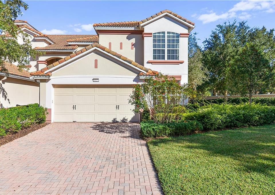 Check out the walkthru video for this FURNISHED, 3 bed/2.5 bath w/2 CAR GARAGE, rare END UNIT townhome-style condo with HUGE greenspace VIEWS (NO REAR NEIGHBORS) in GUARD GATED, resort style community of BellaTrae. This MIRELLA floor plan has a large open downstairs with 20 foot ceilings and has been BARELY USED as a SECOND HOME. The dining/living space provides excellent views of the green space to relax or entertain. The DOWNSTAIRS MASTER BEDROOM has an accented tray ceiling and french doors leading into LARGE master bath. The master bath features DOUBLE SINKS, GARDEN TUB w/separate SHOWER, as well as SPACIOUS WALK-IN closet. The kitchen includes MAPLE CABINETS, GRANITE COUNTERS, STAINLESS STEEL APPLIANCES, ISLAND, and BREAKFAST nook. Enjoy sitting in your ENCLOSED SCREENED LANAI with NO REAR NEIGHBORS. The half bath and laundry room complete the first floor. Upstairs, you'll find the 2nd and 3rd bedrooms, 2 lofts, one small and one large and large 2nd bath with dual vanity sinks, and shower/tub combo. Tons of closet and storage space throughout. Every bedroom has a CEILING FAN for your comfort! The community has a private 12,500 sq. ft. clubhouse with state of the art GYM, FITNESS STUDIO, zero entry HEATED POOL/SPA, MEDIA room, BILLIARDS room, BOCCE ball court, PUTTING GREEN, TENNIS/PICKLE BALL court, and social activities for all as there is a full time Lifestyle director on site. BellaTrae offers GUARD-GATED privacy and low-maintenance living. Your HOA dues also include INTERNET, basic CABLE, 24 hour GUARD GATE, & PEST CONTROL. BellaTrae is Not zoned for short term rental. Close to Disney and other area attractions and conveniently located close to world class entertainment, shopping, dining and in between 2 international airports, this home will make you feel like you are on a permanent vacation. This home will not last long so schedule your showing today!