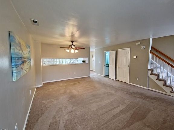 Charming, end-unit townhouse in Virginia Beach! Spacious, great room with wood-burning fireplace and ceiling fan. (Could be utilized as a living room and dining room area if desired) Large, eat-in kitchen with a tile backsplash, stainless appliances, pantry, and a rolling island that would make a great coffee bar area. First-floor half-bath for guests. Upstairs is the primary bedroom, featuring two closets and an attached bath, along with two additional bedrooms, a hall bath, and a laundry area. Outside is a nice-sized, fenced-in yard with a patio, fire pit, and two sheds for all your storage needs! Two off-street parking spaces in front. It has a great location near Salem High School, convenient to area shopping centers and restaurants. Easy commute to area military bases!