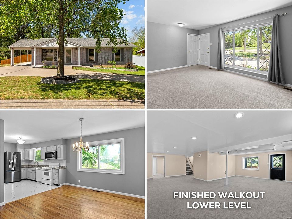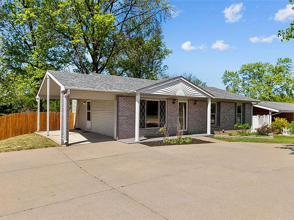 Adorable ranch with FINISHED WALKOUT LOWER LEVEL backs to acres of PEACEFUL COMMON GROUND. Walk to community POOL, clubhouse, playground & sports. Classic brick front, easy-care vinyl siding, covered front porch, newer roof, carport & expanded circle drive. One-step entry & exit. Bright living room with shiplap accent wall, TV mount & triple window. Dove grey raised-panel kitchen cabinets with GRANITE COUNTERS, gas cooking & pantry. Dining room with HARDWOOD flooring is open to kitchen - ideal for entertaining. Relaxing owners suite with step-in shower. Secondary bedrooms feature hardwood flooring & share hall bath with JETTED TUB & rainshower. Updated windows, fresh paint & white 6-panel doors. Flexible lower level for your lifestyle: REC ROOM with gas FIREPLACE, bonus room/den with WALKOUT (potential guest quarters), 3rd bath, laundry & storage. PRIVACY-FENCED oversized .27-acre lot. Near Highways 270/67/Olive/Page & Creve Coeur attractions. Unincorporated with few restrictions. Some Accessible Features
