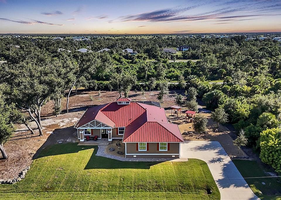 AT LAST ! THE HOME OF YOUR DREAMS IS AWAITING NEW OWNERS! WELCOME TO YOUR DREAM HOME WITH STUNNING SUNSET VIEWS! BUILT TO ENTERTAIN AND WITHSTAND FLORIDA WEATHER WITH SO MANY UPGRADES! WITH RED STANDING SEAM METAL ROOF, IMPACT WINDOWS AND DOORS, POOL WITH FIRE FEATURE, TOP BAR AND WATERFALL! OUTDOOR KITCHEN AND TWO ADDITIONAL COOKING STATIONS IN MUCH SOUGHT AFTER SOUTH GULF COVE .FULL PRIVACY! PUBLIC WATER AND PUBLIC SEWER!SALT WATER POOL WITH THE SEPARATE SHOWER OUTSIDE! So many upgrades! It is in brand new condition! Absolutely stunning 3 bedrooms plus Den with 3 full Baths. Oversized side entry 2+ Car Garage, completed by Cantin Homes in July 2019-home includes-All PGT Vinyl, impact windows and doors, Standing seam Metal Roof, includes 8' Amish built barn door, Open cell foam insulation, aluminum pull down stairs in laundry, interior doors are custom 8 foot tall, solid stain, 5 panel, mahogany door, Den includes 5 panel mahogany doors with seeded glass, wood plank tile in herringbone pattern; 9'4" interior ceiling, custom entertainment center (negotiable), cantilever tray ceiling, pocket sliding glass doors, heated pool with built in front of a beautiful pattern fire feature with waterfall; large outdoor kitchen with weather strong cabinetry, Gourmet kitchen includes 30" gas cooktop with wall mounted-hood, prep-island, large L shaped Bar Top, built in trash pull out, wall oven-micro, a pot filler faucet, level 3 granite countertops, 42" tall cabinets with pantry.All cabinet are soft close, barely used stainless steel appliances! Master suite includes tray ceiling; 2 large walk-in closets; Master Bath includes dual sinks, tower cabinet in center, large walk-in shower with built-in bench niche and multiple shower heads, this bathroom has 16" trans window to let light in but keeps privacy, two additional bedrooms and baths; all equally as elegant; 3rd bath accesses pool; guest bedrooms. The guest bathrooms and den have dark wood country shutters. ADT Security System - water filtration system - two large buried propane tanks - Tankless gas water heater - 22KW .Whole House generator with 8 years remaining on warranty - two pergolas - a public boat ramp as well as several parks in South Gulf Cove - Gulf Beaches and world class fishing are just a 10 / 15 minute drive south to Boca Grande. HomeOwners Association - there is a HomeOwners Association, however it is optional to join; the annual HomeOwners fee is $75.00 . DON'T MISS GOLDEN OPPORTUNITY!