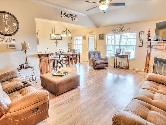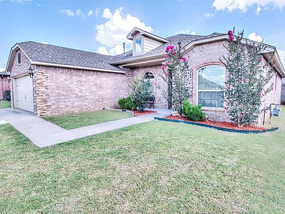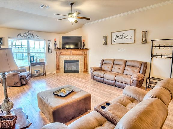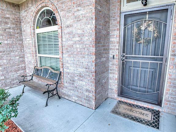 Three bedroom home with flex room. Newly extended width on driveway. Newly extended back patio with added pergola. New carpet in bedrooms and updated living room flooring. Natural stone back splash and under cabinet lighting in kitchen. High ceiling throughout with crown molding. Large master with double sinks, separate shower and tub, with large master closet. Security doors front and back. Subdivision has splash pad and easy access to schools and Hwy 169.