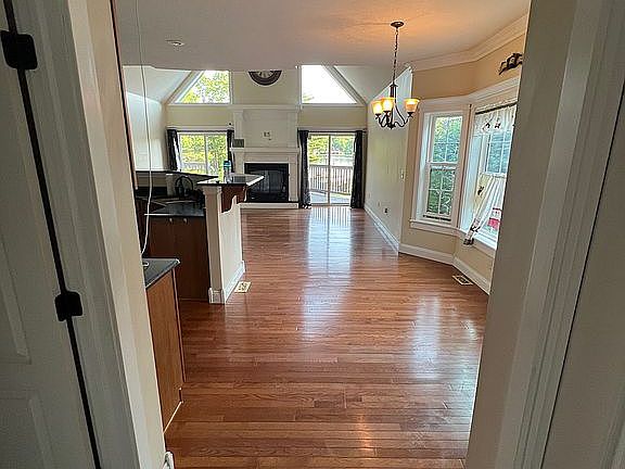 This house has a cathedral ceiling in the living room. The principal bedroom has a tray ceiling . Through out the house has crown molding. The first and second floor have hardwood flooring. The walk out basement has carpeting except for the "apartment size" kitchen area.